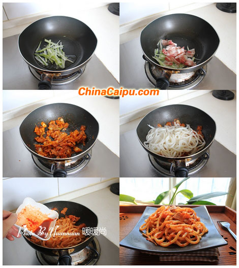 9.放泡菜,翻炒1-2分鐘至肉片入味。