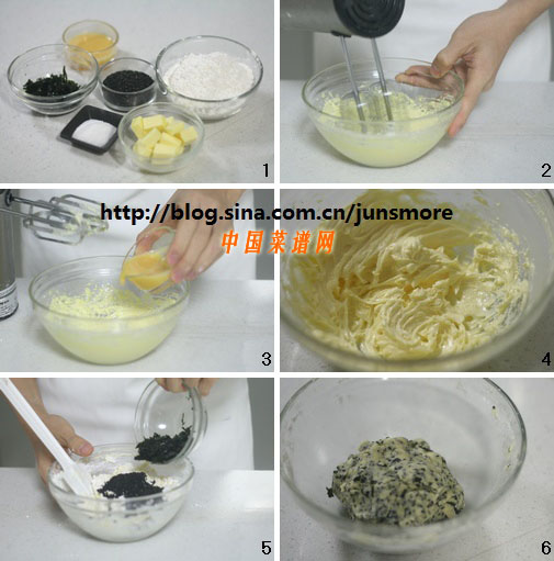 配料:低筋面粉100克,黃油50克,雞蛋25克,細砂糖1小勺(5ml,可省略),海苔片2克,炒熟的黑芝麻20克,鹽2克,泡打粉1/4小勺(1.25ml)