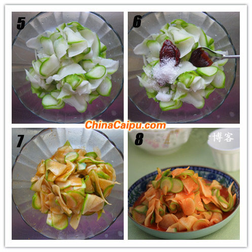 2、然后切片放容器內。片是越小越好,容易腌去水份。而且也入味嘛,吃起來也脆。