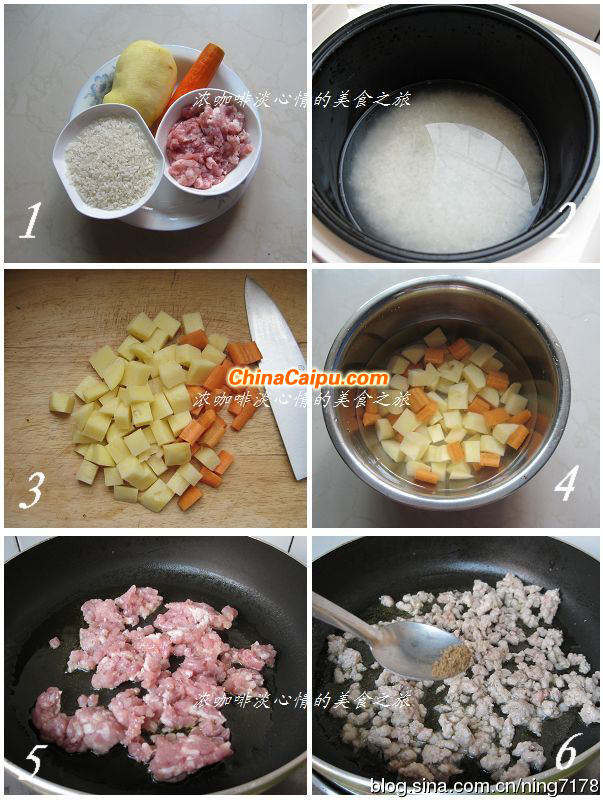 大米1小碗、土豆一個、胡蘿卜1/2跟、肉餡200克