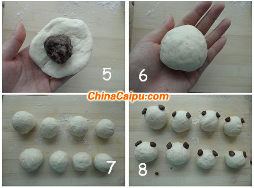 8 將可可面團分成兩塊,其中一塊分成12分,揉成小圓,做熊貓耳朵