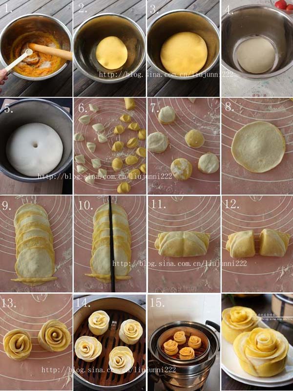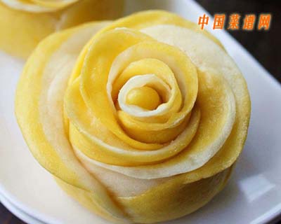 7.我的南瓜面的小劑子兒比白面小劑子兒分得稍大一些,這樣做出來的玫瑰花中黃色多一些,如果想白色多一些,可將白面小劑子兒分大一些,想要黃白各半的話,就分一樣大吧。