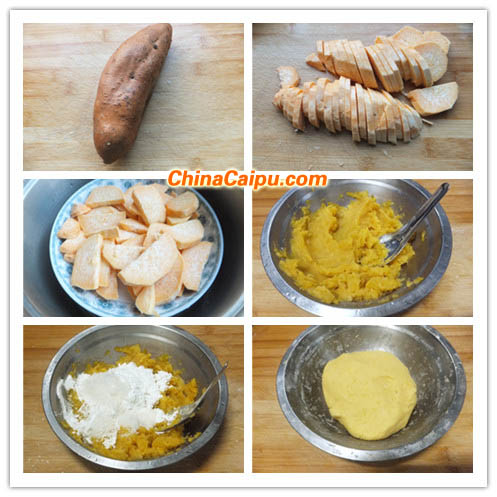 5、紅薯泥中加白糖、糯米粉,要一點(diǎn)一點(diǎn)的加