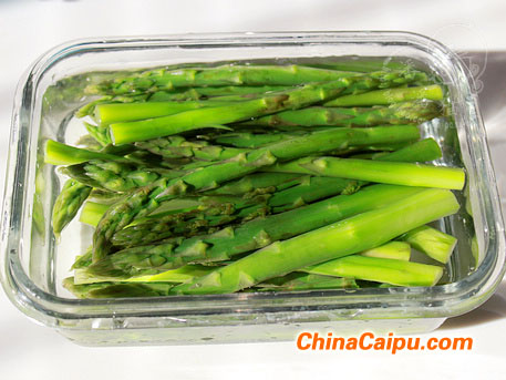 3.撈出來的蘆筍馬上放到冰水中冷卻,涼透后撈出,瀝干水分,裝盤備用。