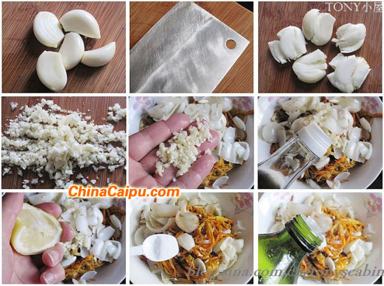 6.在黃花菜里加入蒜泥,蘋果醋;